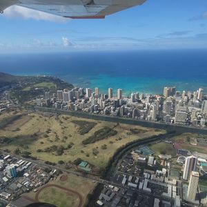 セスナで、ハワイ上空に飛び立つと、ワイキキのホテル群が一望できます。