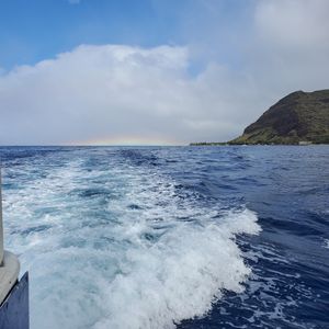 雨が降ったり止んだりで天候に気を揉みましたが、当日の天気はまずまずのコンディションでした。虹とホノルル空港から離陸した飛行機のコントラスト、海上から見るダイヤモンドヘッドやワイキキの街並みは、とっても気分を高揚させます。外海は意外に波が高く、服から何から‘べしょべしょ‘に濡れましたが気候も良いので、言ってみればディズニーランドで放水を浴びているようなものですね。鯨は残念ながら見れなかったけど、シーズン内ならもう一度無料で乗れるパスも貰えるし、満足感は十分ありました。「Thank you」ぐらいの英語しか喋れない50代夫婦が何を血迷ったか英語ガイドしかいないツアーに参加しましたが(20組ぐらいの参加者のうち日本人グループは我々ともう一組だけでした)、言葉はわからないなりに結構楽しめますよ。ただ救命胴着はありませんので船外の行動は自己責任となります。