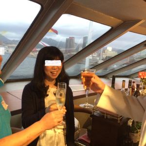 集合場所でツアーを示すシールを胸に貼ったおかげで、乗船時に『Congratulations』と数名のクルーから声をかけていただきました。席は2F?(5スターの上層階の下)の窓際の二人席でとても景色が良く、料理もGoodでした。