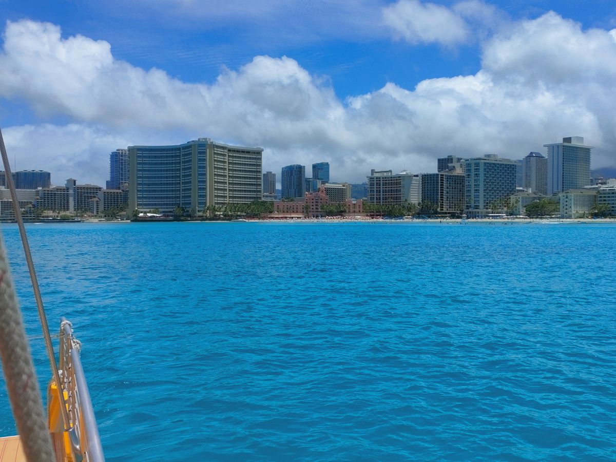 何回もホノルルへ来ていて、過去ノースショア・マノア・カイルアなどの観光地でグルメ中心に楽しんでいました。今回、ホノルルの海を90分のセーリングを経験。チェックインでは、ハーフの素敵な女性が丁寧に説明してくれ、乗船では明るい男性乗船が色々なサービスをしてくれ、いつもは街から見ていた風景を、海からホノルルの街やホテル・ダイヤモンド・太平洋を見ることができ、最高でした。天候は快晴ではなかったけど、日焼けせず、心地よい海風と美味しいフリードリンクを、スタッフがサーブしてくれ、ビール・カクテル・白ワイン・シャンパンを飲み、ほろ酔い加減。42名?の定員で、14名(日本人6、オーストラリア人2他)で、写真を取り合ったり、おしゃべりしたり(当方オーストラリア人の親子と歓談)と素敵な時間でした。