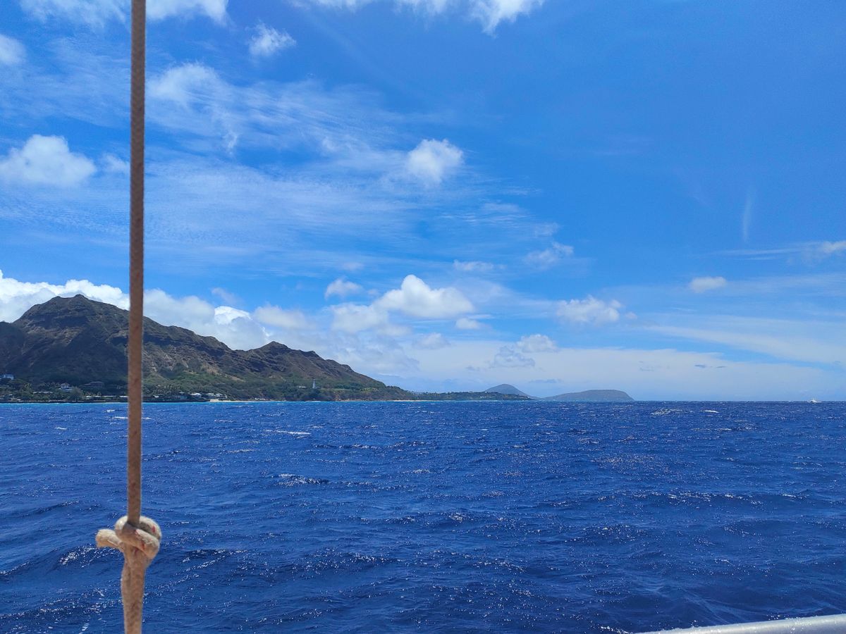 I rode on the catamaran for the first time in about 10 years. This time, I chose the Na Hoku because it included an all-you-can-drink option. The view of Waikiki and Diamond Head from the sea is exceptional. The sea was relatively calm, making it the best cruising experience. Additionally, I enjoyed the all-you-can-drink option and had about 6-7 Mai Tais. There were only four of us, including a Japanese couple, so it felt quite private.