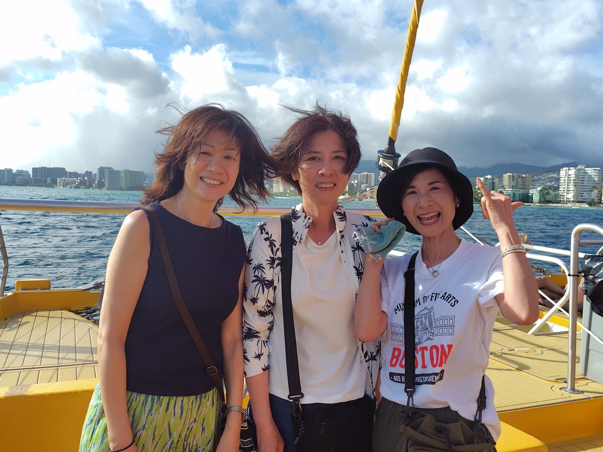 The blue sea, the blue sky, and the view of Diamond Head and Waikiki are amazing. The sails caught the wind, and riding the waves with a pleasant sway was a lot of fun. I participated with my three sisters, and it became the best memory. Of course, the beer was delicious too.