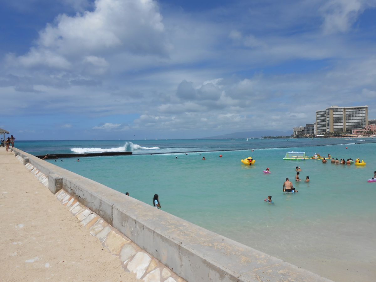 集合場所はアウトリガーリーフホテルの海側の出口から出て砂浜を左に進み、オレンジのパラソルと催行会社名の入った旗が壁に貼ってあるところです。結構わかりにくいです。集合時間の2:30より前に行ったところ船がまだ来ないから45分にまた集合と言われ、再度行きましたがそこからもだいぶ待ちました。出航したのは結局15時15分頃だったかな?欧米人らしいおばさま集団と、数組の夫婦、ファミリーなど。船内の案内は英語のみです。青い海を風をきって走る船をイメージしてたのですが、ゆっくり走りながらお酒と音楽を楽しむ、というものでした。天候に恵まれず青い海どころか雨が降ったりしたので残念ですが、それなりに気持ちは良かったです。おばさま方は好きな曲をリクエストして踊ってとっても楽しそうでしたよ。