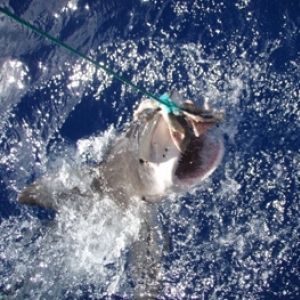 As the first four made there way into the shark cage, the remaining four, including me, waited on board and watched the sharks from the surface. These creatures just circled the cage and boat and at times a Tiger Shark would pop his head out of the water to munch on some fish. This shark could have easily bitten the crew member, but all he (she?) did was nibble and go.
