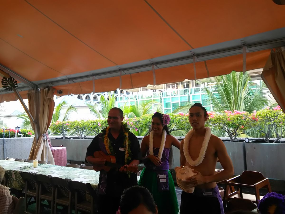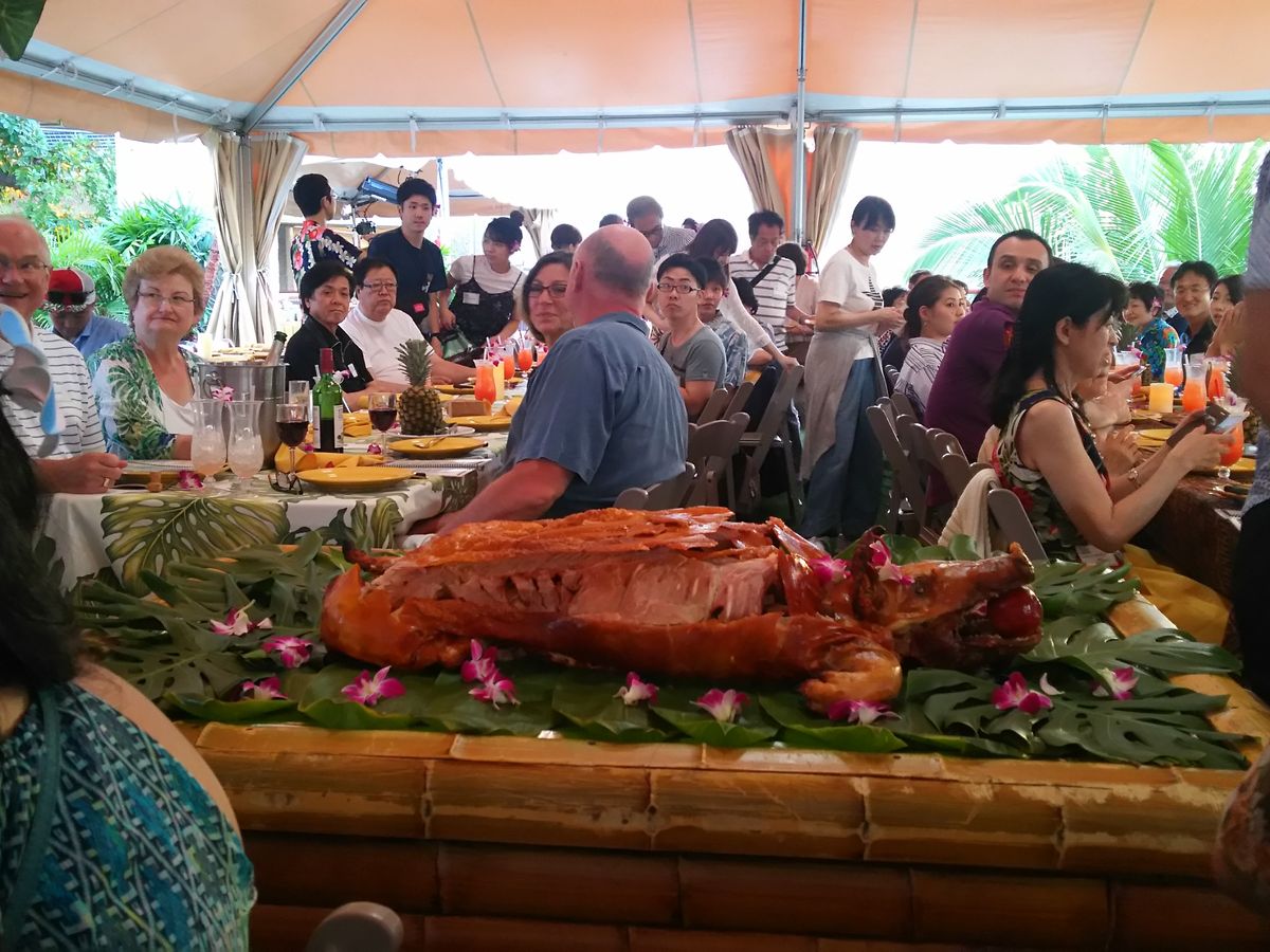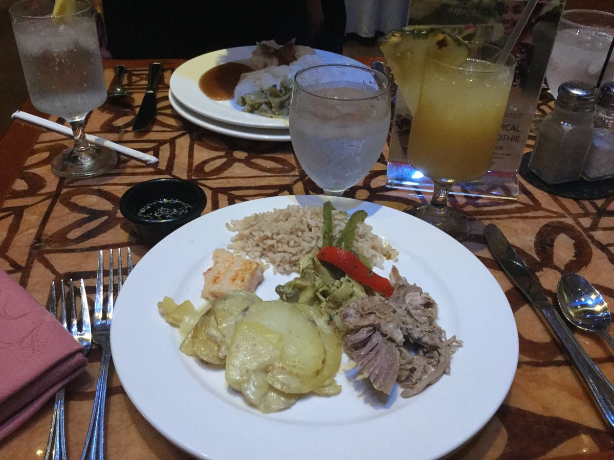 生のパイナップルとマイタイが出てしばらくはフラの歌と踊りを楽しめます。テーブルの順番にブュッフェを取りに行くのですが、豚の丸焼きを含めこれは正直、あまり美味しくありませんでした。でも、おもてなしのサービスはとても良いと思います。
