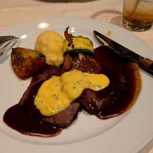 The singer couldn't sing; we had to queue for our starter (only lettuce plated at the table; the lobster was not prepared, we were provided with lobster crackers and a pick (not what we were expecting, dressed in our best clothes); there was no finger bowl or wet wipe; our steaks were cold and the server came so infrequently we did not get to use two of our drinks vouchers.