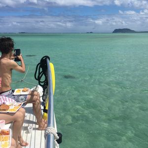 The day started with a bus picking us up from Waikiki to get to Kaneohe Bay. It was short 25 min drive to get there. Once we got off the bus, we headed over to the boat area to join the crew. A tour guide (both Eng and Jpn) was present to walk us through the process the whole time. She walked us through some safety cautions and basic procedures, and the whole crew was very pleasant to be around the whole time.