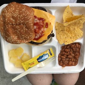 I've been to various oceans before, but I truly felt that it lived up to its name, Heavenly Ocean! While we were playing, the crew grilled meat on a barbecue. I had some concerns about the quality of the meat since it was labeled BBQ, but what we got was a hamburger! We made our own sandwiches with the meat, cheese, and vegetables... there were also beans and chips, and it was delicious.
