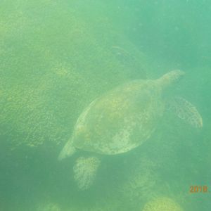 While snorkeling around the coral reef, a turtle swam alongside me.
