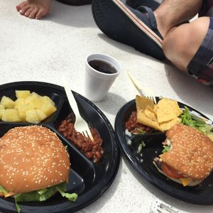 ランチのバーガーも太陽の下で食べるのは最高!ミニチップスも好きなものを選べます。