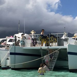 二度目は、カメがよくいる所でダイブしました。こちらの方が海の透明度も高く綺麗な魚がたくさんおり、とても綺麗でした。まるで水族館の水槽を見ているようです。カメも目の前で見ることができ、感動です!船に戻る人、滑り台等で遊ぶ人、シュノーケリングをする人と自由時間があって良かったです。私はずっとシュノーケリングをしていたのですが、滑り台等でも遊べば良かったなと思いました。軽食のハンバーガーも手作り感があり美味しかったです。スタッフの方々皆さんノリが良くとても楽しい時間でした。早朝の便だったので、午後は丸々使えます。天気にも恵まれ、最高の思い出となりました。またハワイに来た際は、是非参加したいと思います。ありがとうございました。