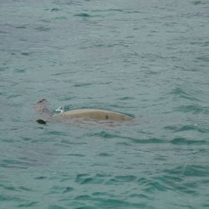 1時間ほどゆっくりして船にもどり、ハンバーガーの昼食をとりながら、シュノーケリングポイントへ移動。その間に、亀発見、ラッキー!さらにアザラシ?!どうもこのサンゴのラグーンに迷い込んだようです(日本人スタッフのYUKIKOさんの8年いて初めてとのこと)。左手にジュラシックパーク撮影の山を見ながら、シュノーケリング。ライフジャケットがあるので、楽ちん。周囲に浅瀬が取り巻く先ほどの「サンドバー」とへ違い、シュノーケリングポイントの周囲200mほどのサンゴ群の外周は5~10m深さ。その深さゆえ、ラッキーにもここでも「亀」発見!