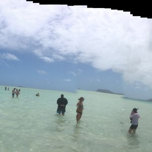 港を出て、15分ほど沖の「サンドバー」、水深20cm程の白砂(サンゴから)の200m四方ほど、海岸から沖にあるので、「海の上を歩く」という不思議な素敵な体験、家族して満足!