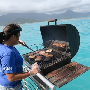 The hamburgers made on the boat were delicious, and the photographer played the ukulele very well. The woman who danced the hula was also skilled, and there were many entertaining elements that kept us engaged.