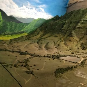 At the Jurassic World filming location, the set where the Indominus Rex was contained remained intact, and we were able to drive inside. It was like an exploration course on a mountain road among several options. It felt like we were heading towards the bumpy road deep in Kualoa Ranch. While we couldn't get out of the car there, we could take photos from inside. I was sitting on the left side, so I was able to take pictures with the Indominus Rex's claw marks in the background.