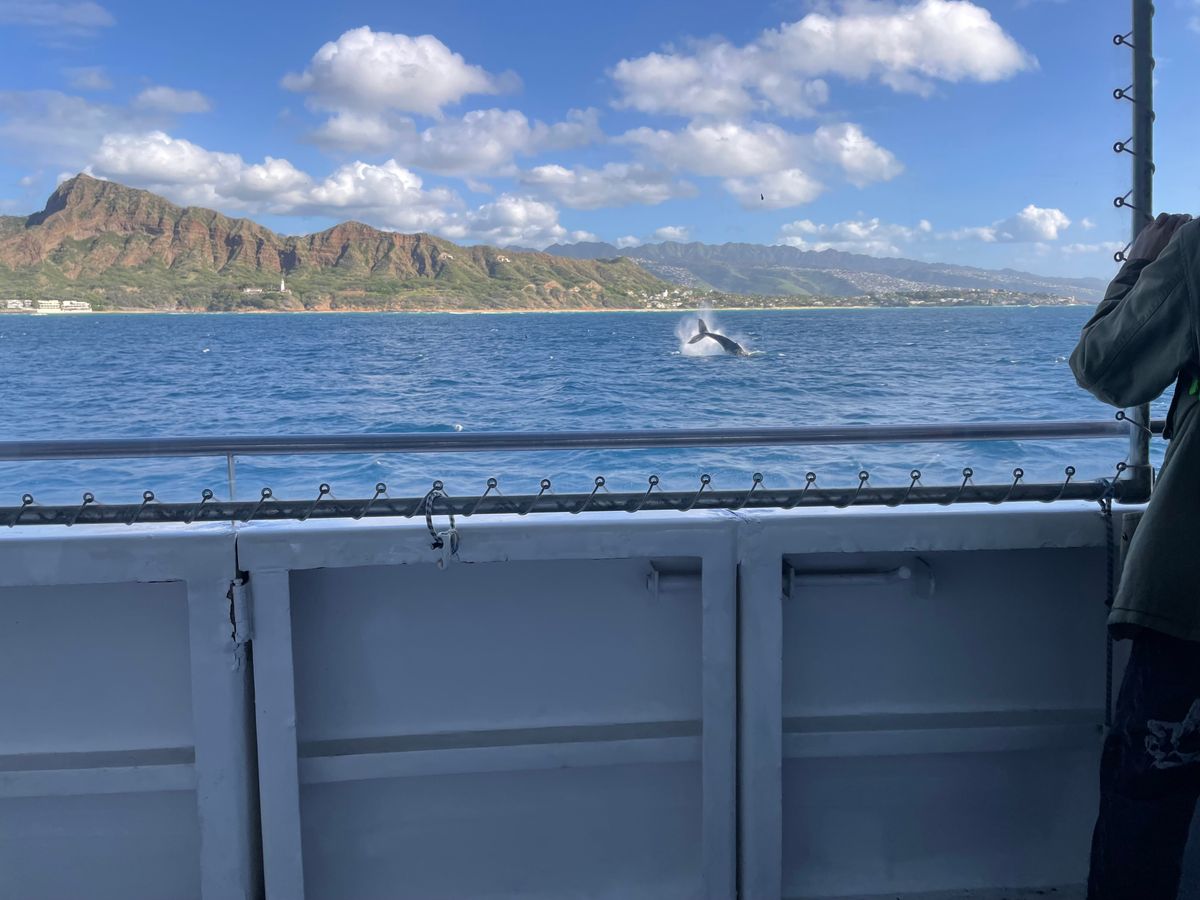 I was looking forward to participating since they were confident about whale watching. They mentioned that if we didn't see any whales, we would receive a free pass for the next time. The explanations were easy to understand, and they said that humpback whales come up to breathe every 45 minutes. We saw over 30 whales swimming around, but they were hard to spot. Just when I was about to give up, suddenly they appeared! The first one was a baby, and the second was an adult whale, posing beautifully with Diamond Head in the background! It was an incredibly satisfying tour. It might be a good idea to have some motion sickness medication on hand.