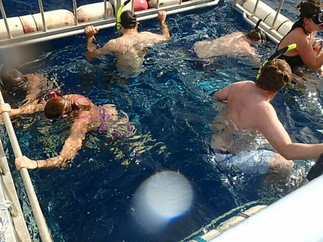 We went out to sea on a boat and once we arrived at the spot, we put on our snorkels and entered the cage.