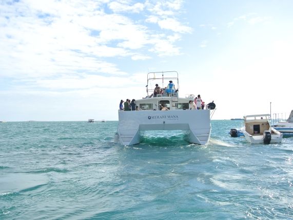 On this day, there were many participants, and three boats set out. After the boats departed, we first went to see sea turtles in the offshore waters, and if we were lucky, we might encounter manta rays. After that, we headed to the sandbar, but since I didn't plan to go snorkeling and just wanted to walk on the sandbar, I didn't bring my swimsuit, so I got wet up to my thighs during the 10 to 20 meters to the sandbar. It dries quickly, so it might not be necessary, but it's better to bring a swimsuit. After arriving at the sandbar, those who want to snorkel will do so in the outer sea, but it's also fine to stay on the sandbar. The morning tour is short, so even if you walk on the sandbar for a little while, it goes by quickly, and I recommend that. The scenery was amazing.