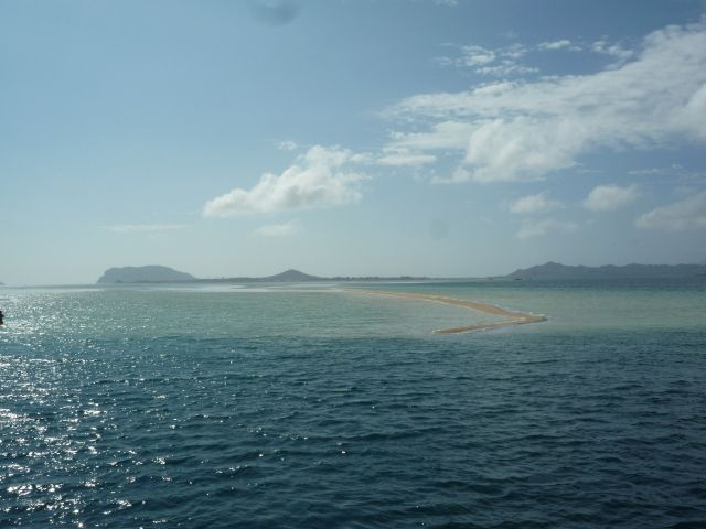 ホテル迎えからバスに乗ったくらいから雨が降りだし、どうしても綺麗な海のサンドバーを見たかったのでツイテナイ・・・と諦めモードでした。。。船に乗る頃には少し青空が見えてきて、10分ほどしてサンドバーに着いて下り立つと太陽が射し白いサンドバーが表れてきました!本で見たあの綺麗な景色が目の前にそのまんまです。何とこの場所は2年くらい前まで日本では知られていなかったそうで、映画やPVの撮影にも使われたそうです。。風があったので肌寒く感じましたが、ウミガメの泳ぎも見れ晴れてくれたので良かったです。