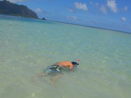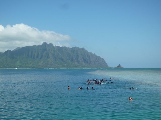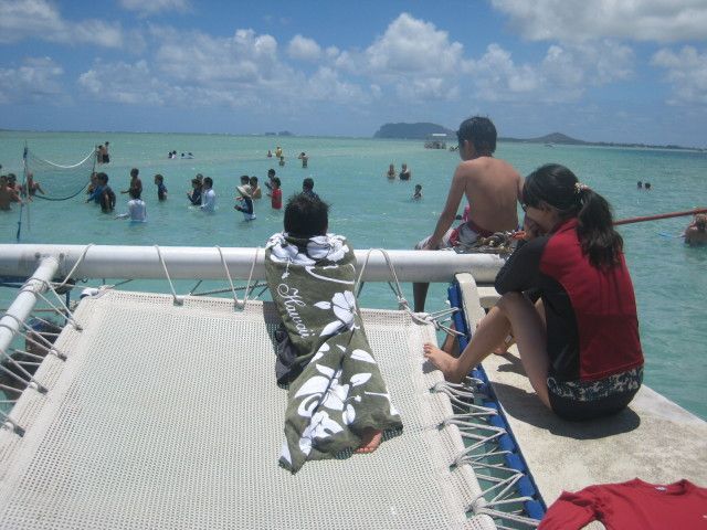 船に乗って行くのに 砂浜が現われて膝下の海水・・・いったいどんな所だろうと思いながら 朝一番のツアーに参加。元気イッパイのお姉さんの説明も良かったし 「ツアーと契約してるのか?回し者?」かと思うほど 海亀さんもたくさん出てきてくれて あちこちで歓声! 歩いたり泳いだり・・・真っ黒のカッコイイお兄さんも安全に気を配ってくれ シュノーケル初体験の私も安心でした。温かいTea・サンドウィッチも 濡れた体のままバスに乗って帰るのも ハワイ流?ちなみに参加したお嬢さんの中に 「水分を吸い取るクロス・・・スポーツ店で買ったとか」を持ってきている人がいて なるほど!と思いました。