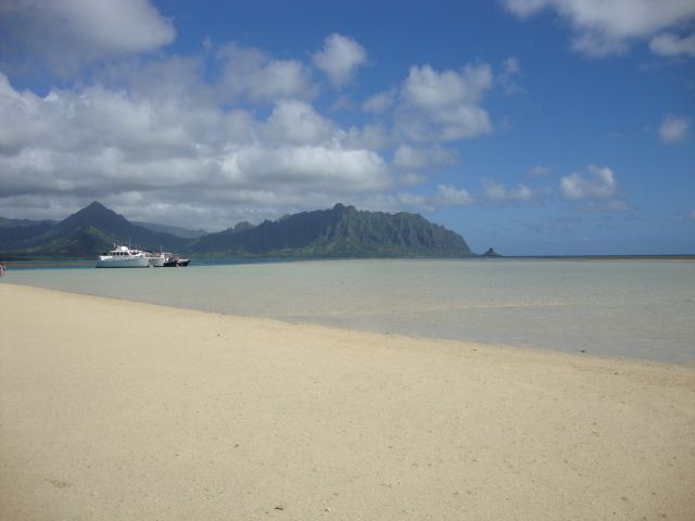 ハワイ旅行でサンドバーの上に立つ夢がかない最高でした。サンドバーの上を歩くと水が足首くらいまであったけれどその上に立ち一面パノラマできれいな青い海が見えてとても気持ち良かったです。スタッフの方は「写真を撮りましょう。」と親切に声をかけて下さりいろいろな方向を向いた写真を撮って下さいました。