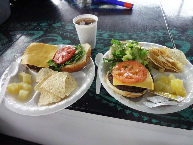 The BBQ burgers on the boat were delicious. While enjoying the beautiful ocean view, we ate hamburgers and listened to a lot of Hawaiian music, making it a relaxing day.