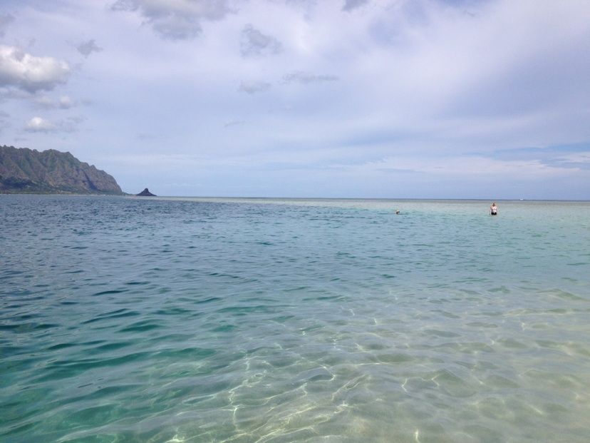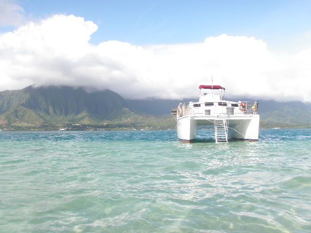 驚くのはカネオヘ湾の綺麗な事、船の係留されている港でいきなり珊瑚や熱帯魚が見られ。いざ船に乗って沖に出ると、あちらこちらでウミガメ(ホヌ)を確認。サンドバーは膝下位の水位でしたが、看板に偽りなしの素晴らしいロケーション。その後のシュノーケルでは、潜って3秒で珊瑚の間を泳ぐ魚の群れに遭遇で言う事なし。