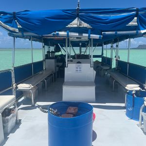 For this second attempt, I checked the tide chart for the sandbar in Kaneohe and chose the day and time when the tide would be the lowest during my stay to participate in the tour. It was perfect. When we arrived and moored the boat, the water was about calf-deep, and even after the first snorkeling session, which lasted 20 minutes, we returned to find a sandbar with broken coral exposed about 50 meters away. It was practically land (see photo). The quality of the sandbar experience depends on the tour company, but ultimately, the tide conditions are everything. I believe those planning to go should choose tours that operate during low tide, referring to the tide chart as much as possible. However, when walking to the sandbar, beach shoes are essential. The soles of your feet can hurt, and if you're unlucky, you might get injured. Captain Bruce already has established know-how, and there was a Japanese guide on board, making it a comfortable experience for Japanese participants. The spam musubi we had on the boat was very delicious. During snorkeling, we even encountered a honu (sea turtle) (see photo).