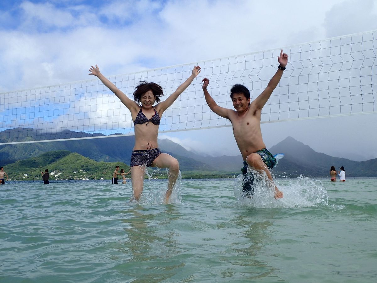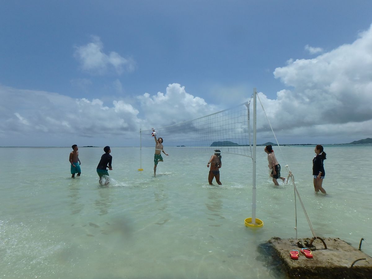 パラソルの下でのんびりとはいかなかったけど、ひざ下の水位だったのでガイドさんや参加の皆さんで童心にかえってビーチバレーを楽しみました。