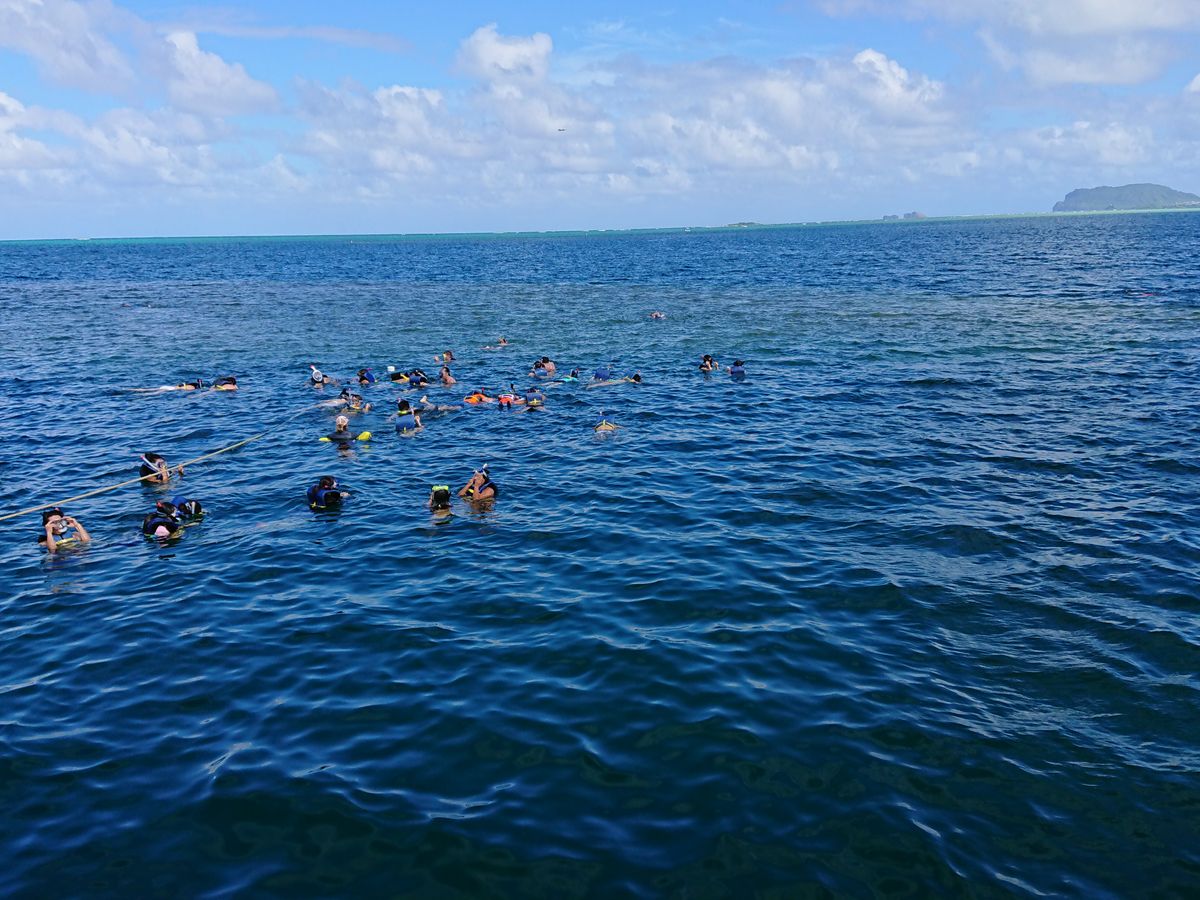 快晴の中サンドバーへ。この時期は水位が腰位まであり、テレビで見るような砂の上を歩くことはできませんでした。その分シュノーケルではカラフルな魚やウミガメと一緒に泳ぐことが出来、大いに盛り上がりました。