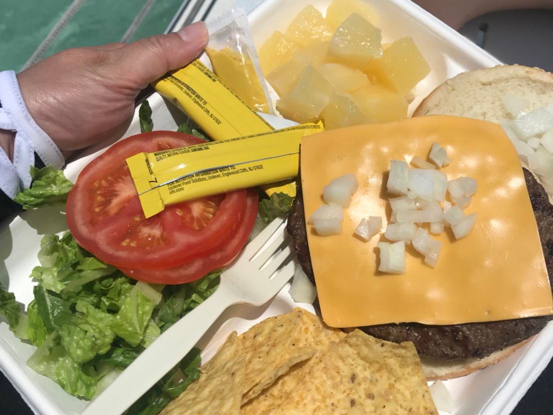 After playing at the sandbar, I had a hamburger on the boat. They grilled it right there, and it was very delicious! ✨
