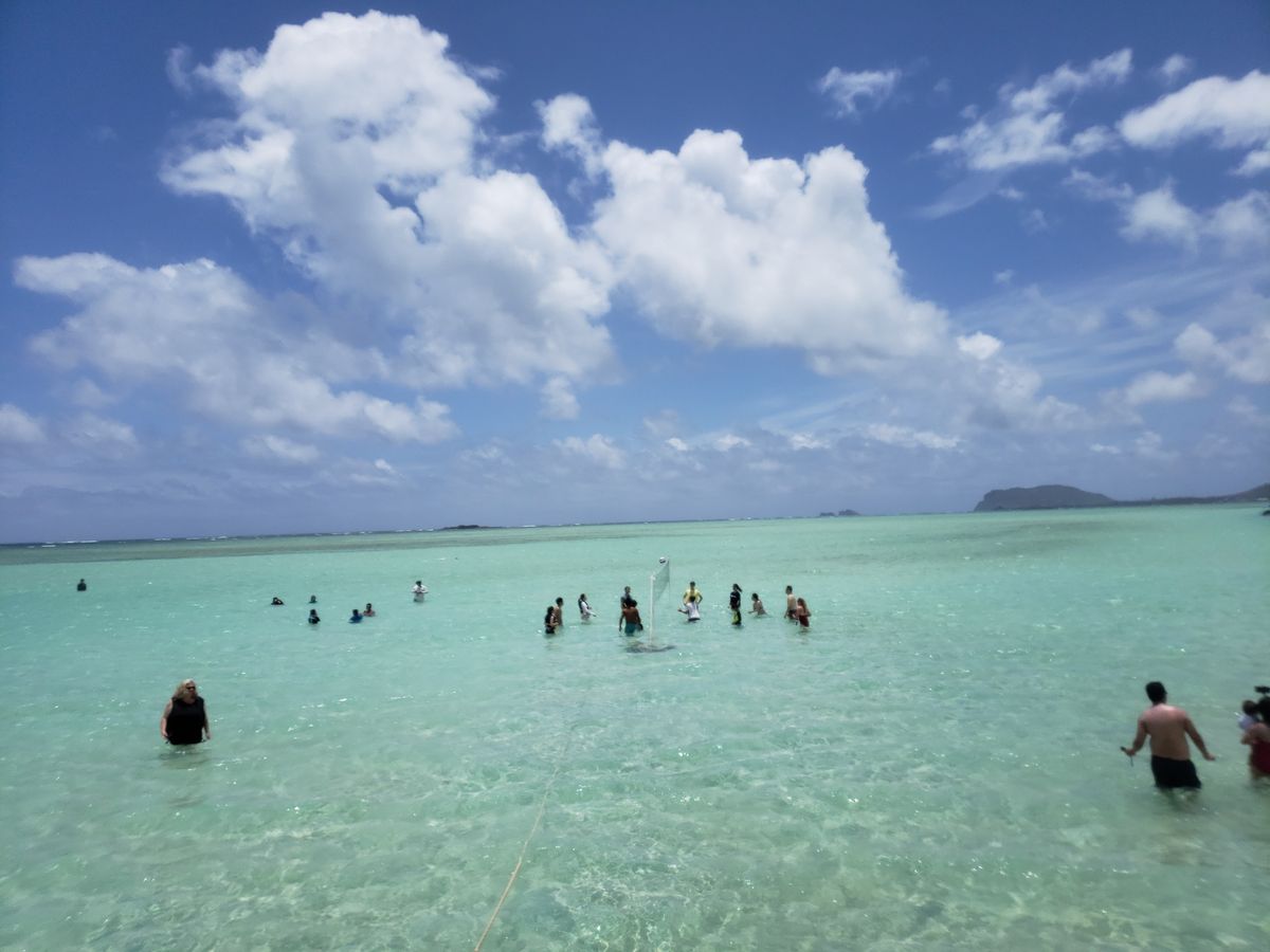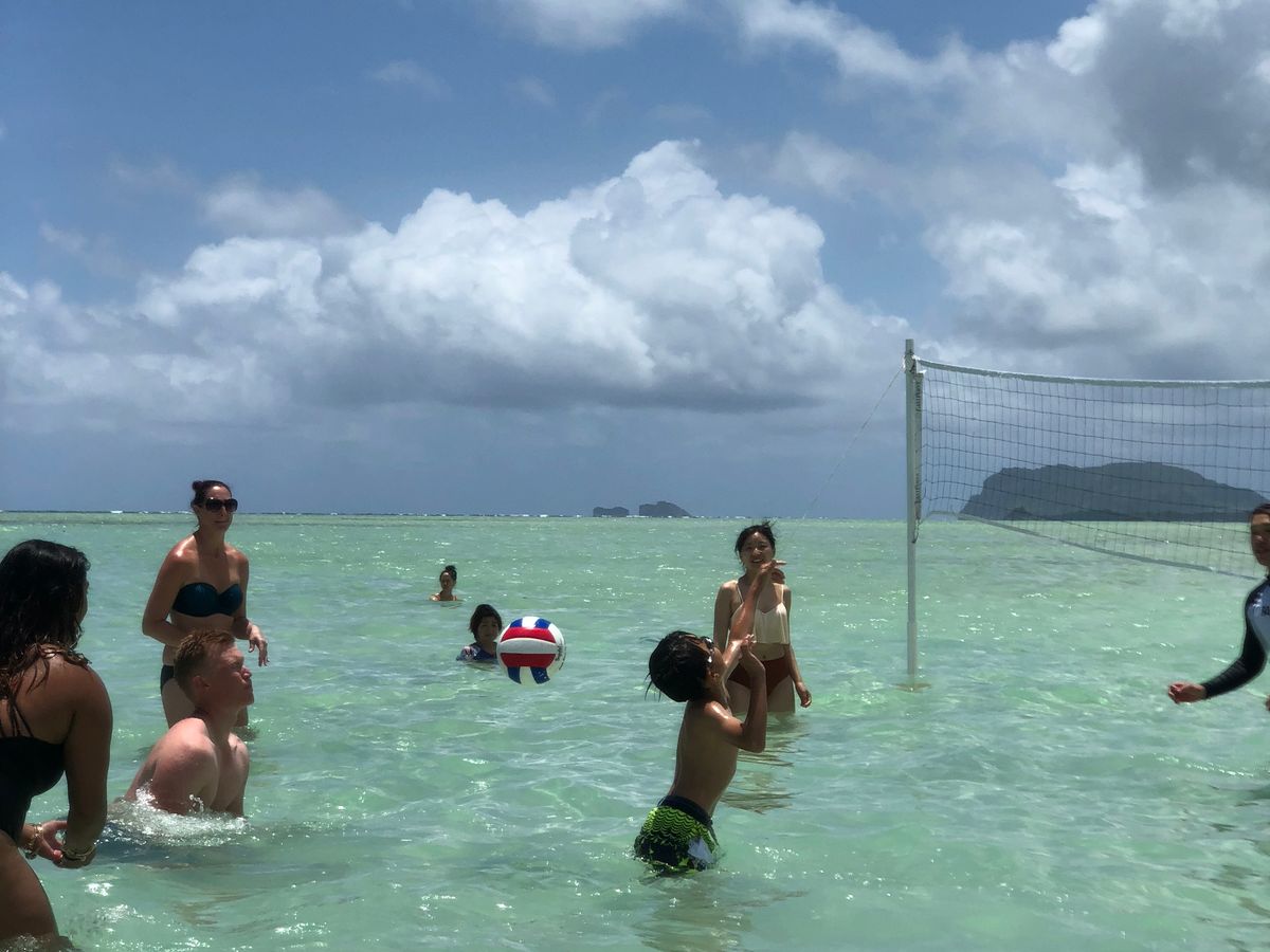 潮の満ち引きなのか、時季なのか?、海水が腰の高さでした。 それでも、ビーチバレーやったり、シュノーケルの練習が出来たり、船の上でのんびりしたり思い思いの時間を過ごしていて皆さん楽しそうでした! シュノーケルは未体験でしたが、とてもとても楽しめました! スタッフの方も、日本人がいらっしゃって、英語と日本語とを交互にしてくださるので安心です。