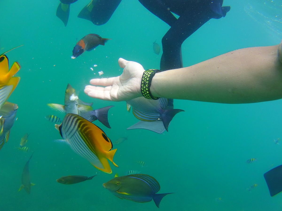 美味しいハンバーガーを食べた後は、シュノーケリング。こちらも透明度はやや悪かったものの、手からエサを食べてくれる色とりどりの魚に癒されました!