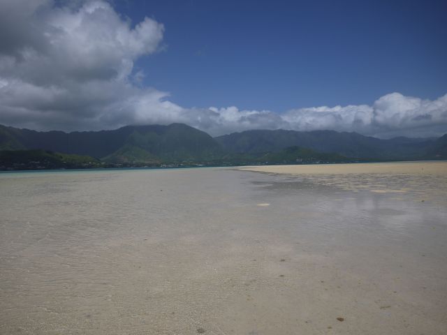 I wondered if the water would have been a bit shallower if the boat hadn't had issues that delayed our departure. The bottom was covered in white coral sand, and I could see the mountains of Kualoa, which were very beautiful!