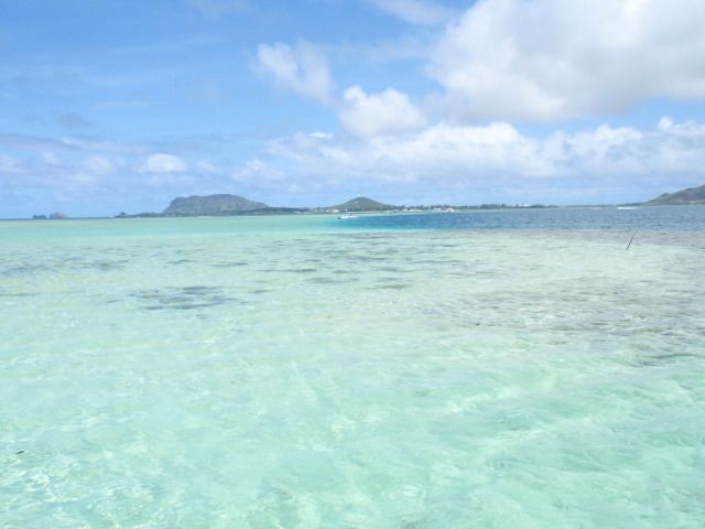 その後はシュノーケリング。息子はスイミングを習っていたので、もちろん参加。私も初日のハナウマ湾で、やや慣れたので参加。けれど、水深20メートル。距離は往復で100メートル~だと思います。膝ほどの水深からいきなり、深くなります。