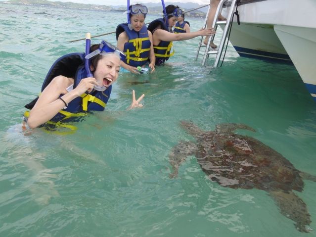 シュノーケリングでは目の前にカメが現れ、カメラを構えていた自分の方に向かってきたので怖かったですが、シュノーケリング後もカメと遊ぶことができました。