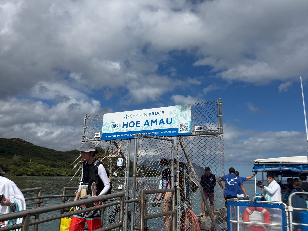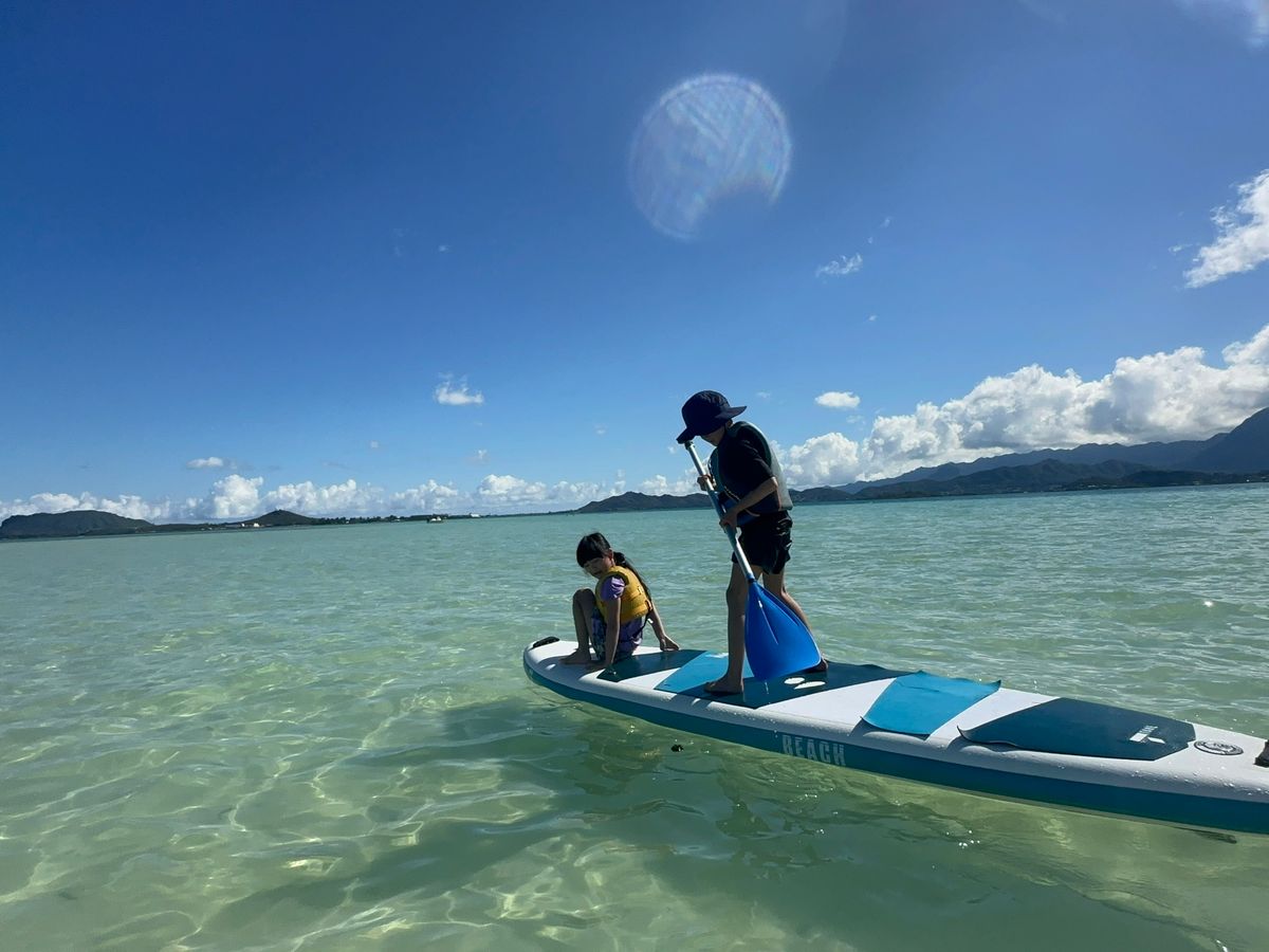 In December, during the winter season in Hawaii, the sandbar was underwater, but we descended onto the emerald green sandbar, and it was a wonderful experience. We played on the SUP and enjoyed our first snorkeling, where we were able to see tropical fish and sea turtles, which was a lot of fun. However, there were many participants, and after the English guide, there was a Japanese guide, which meant we had to wait. I wished they could have explained simultaneously for the Japanese participants.