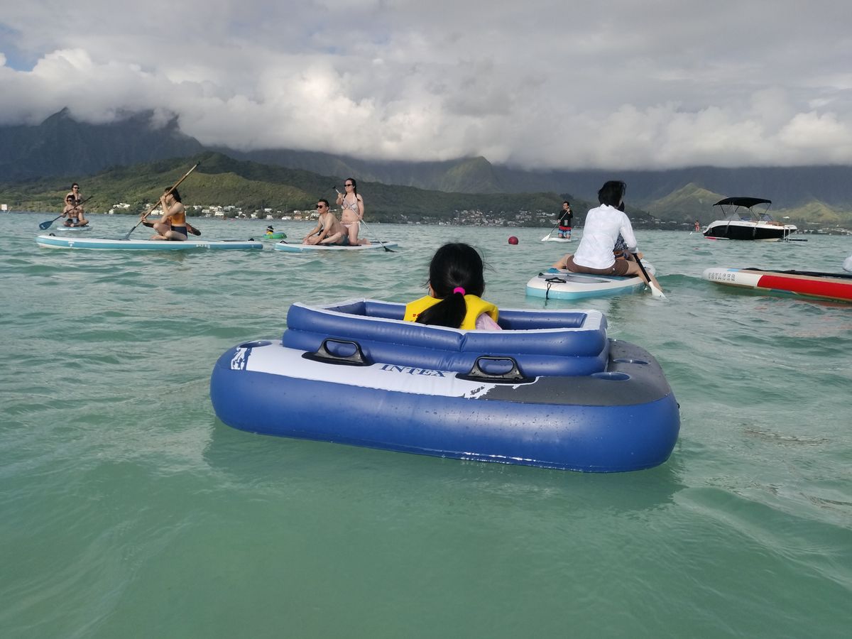 港から船ですぐに着くところにあります。2部構成ではじめは浅瀬をSUPで楽しみ、後半はシュノーケリングでした。干潮時の砂浜を想像していましたが、満潮時に行ったので、大人の膝上程度の浅瀬でSUPをしました。小さい子は小さいボートフロート(投稿写真)に乗せて、引っ張りまわして遊びました。しかしながら、後半のシュノーケリングの方は、かなり深いところまで行きますので、ライフジャケットをつけていますが、シュノーケリングに慣れていない子供には少しレベルが高いかと思います。結局、子供をZAYAKに乗せましたが、こちらも思ったようには安定せず。しかしながら、ウミガメが結構な確率で見られます。