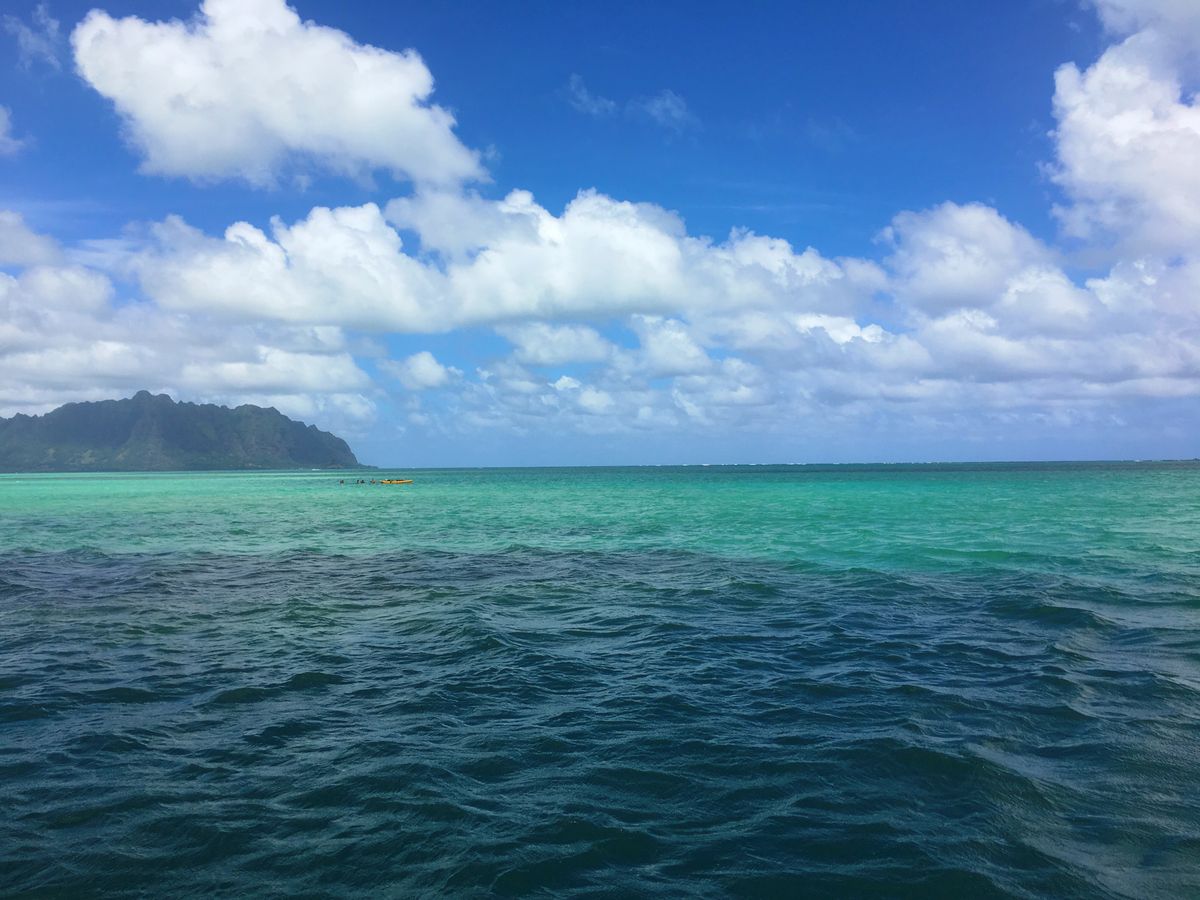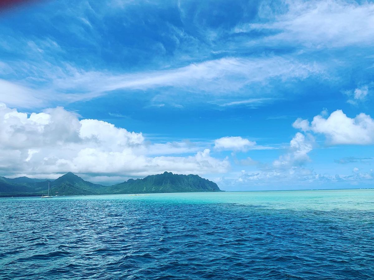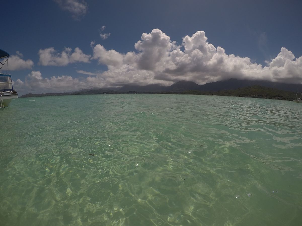 You can clearly see the boundary between the deep blue sea and the clear light blue water. In the distance, you can see the mountains of Oahu and Kualoa Ranch. The view was amazing.