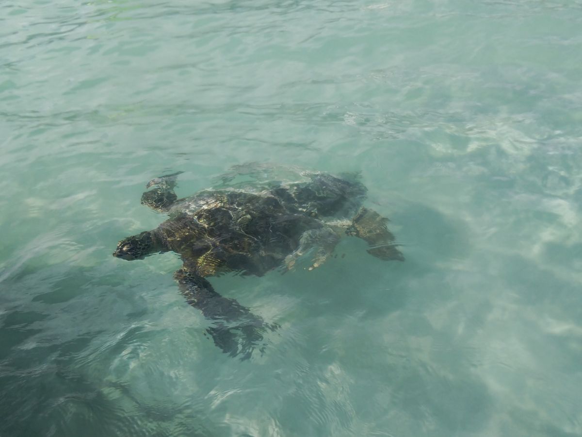 停泊している船の近くを泳ぐウミガメを到着してすぐに見ることができ、シュノーケリングでは海底のサンゴの上で休んでいるウミガメとたくさんの魚を見ることができました。