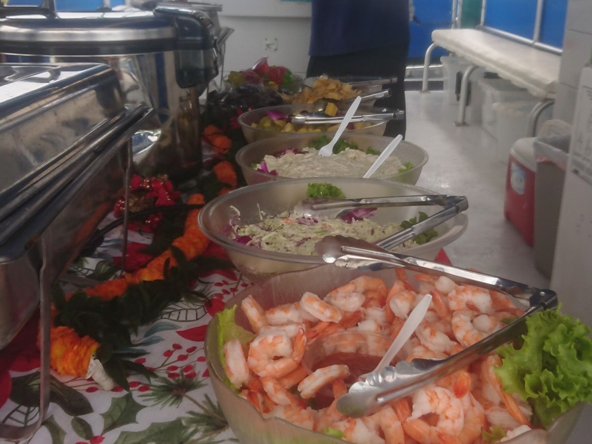 過去のディナークルーズ体験の中では一番ゆったりとした雰囲気と快く過ごせたと思う。が、しかし過去体験の中で最も料理が私の口には合わなかった。ビュッフェ方式だか、肉料理は全て私にとって臭く、野菜も新鮮とは言えず、どれもがしんなり、さらばパンなら…が、これまたパサパサでモサモサ…まぁ海外、特にアメリカのパンに多い傾向ですが、口の中の水分を全て持って行かれるかと思いました。よくここまで質を落とせるなと思うほどのレベルです。すなわち料理は一口食べただけでその後はまったく手を付けずじまい…。サンドイッチとかハンバーガーなどの方が100倍良いと思います。それ以外はとても良いのに料理がダメだと全てが台無しなんですよ。最近のハワイは昔に比べてとてもレベルアップしたレストランが増えてきた(オーナーや料理ディレクターが日本人か日系のところが増えたのでという理由も少なくない)ので、今回はビックリするくらい料理でした。あくまでもフードアナリスト(レストランの格付けとかしております)としての私の極めて個人的な見解です。