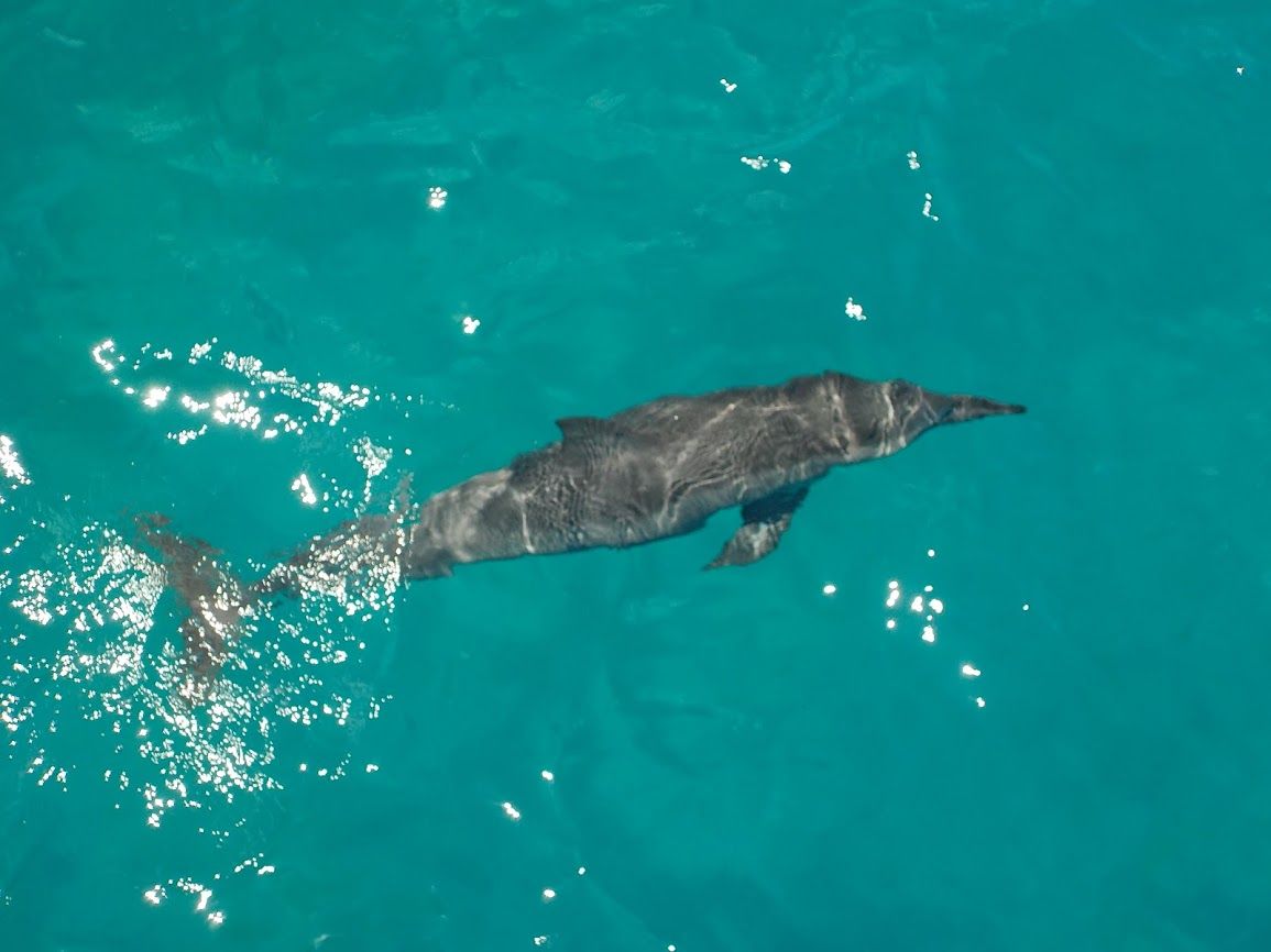 On this day, perhaps due to the strong winds, the waves were high, and the boat rocked quite a bit, causing a few people to feel unwell. About 20 minutes after departing, we had our first encounter with dolphins. We spotted a pod about 10 meters ahead, so we put on our goggles and fins and jumped in together. Unfortunately, during the first jump, the dolphins swam away, so we couldn't swim with them.