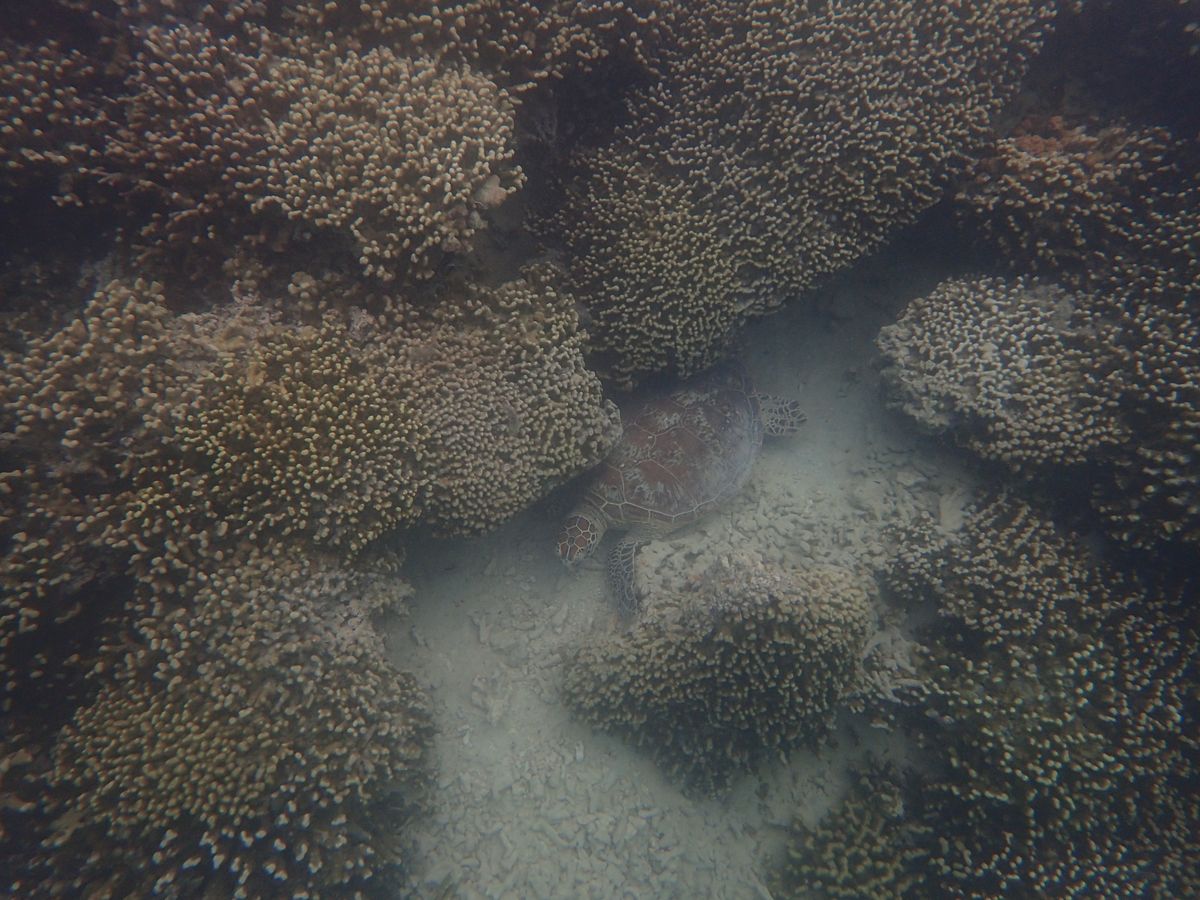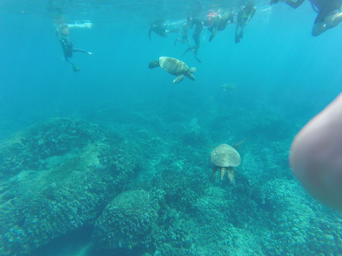 During snorkeling, I saw about three sea turtles! They were mostly hiding behind the coral, but when I was playing near the boat, a turtle swam right up to me! It was so close that I was surprised.