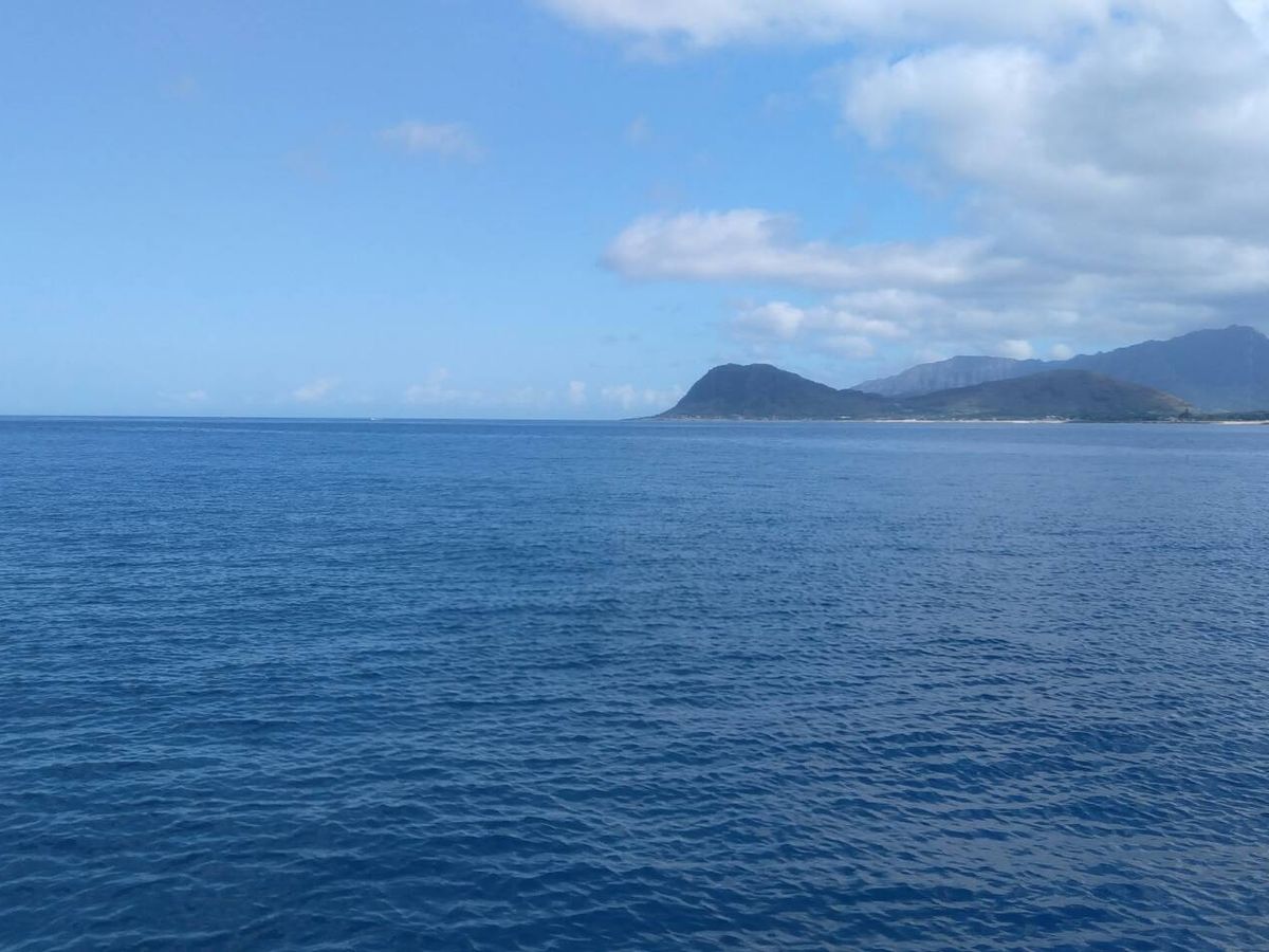 ワイキキからバスで1時間弱の海岸から、船でイルカ生息域まで行きました。