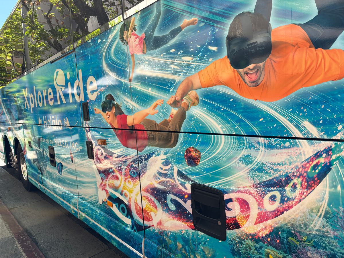 The bus arrived 15 minutes before the meeting time, so I was relieved to recognize it right away. While looking for various activities during my free time, I found an event that piqued my interest and made a reservation. Since it was a new service, I boarded with excitement. The female staff member greeted us cheerfully in Japanese and explained the equipment very thoroughly. The device can be adjusted to fit each individual, allowing for a personalized setup. Once the video started, multiple power stones appeared. By using my palms to grab them, I could hear various explanations about Hawaii's history.