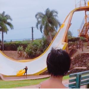 My mother, who is in her 50s, also challenged herself on the slides! There are many slides that adults can enjoy as well. It might be better to wear a type of flip-flop that doesn't come off easily (the kind that holds your foot) so you don't have to keep taking them off.
