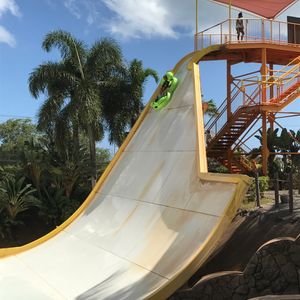 The slides are quite fun even for an adult like me. I particularly recommend the Tornado. However, to use the slides, you have to walk barefoot up concrete stairs, which can be a bit hot on your feet (you walk up to a slightly elevated area by yourself).
