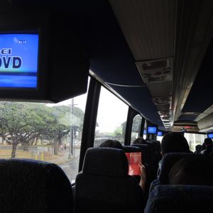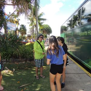 プール当日!朝起きると、なんと曇り。外に出ると半袖で若干肌寒いくらいでした。みんな心配しながらバスに乗り、いざwet and wildへ。ホノルルから西海岸にあるwet and wildに向かうまではバスで約1時間ほどかかりました。