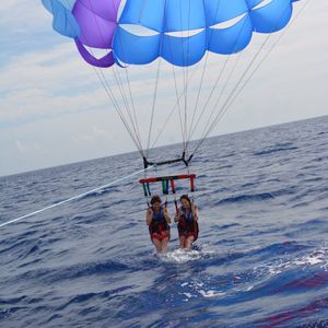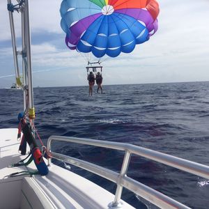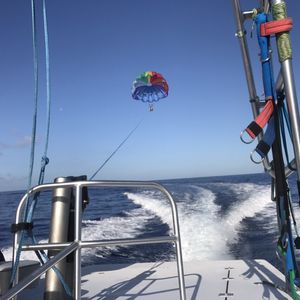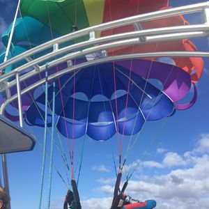 当日予約していた時間にはエンジントラブルのため欠航となりました。翌日に変更をお願いされましたが、帰国日のため変更ができず強くお願いをし30分後に出発する別のボートのツアーに参加しました。私たちの他に1組しかおらず、パラセーリングの時間も長かったと思います。クルーザーも運転させてもらい、遠くにクジラを見ることもできました。飛行中の写真をスマートフォンでもう一組と撮影し合いましたが、30$払って写真も購入しました。120mを選びましたが、高さも丁度よかったと思います。すごく楽しく友人はマリンスポーツの中で1番楽しかったと言っていました。