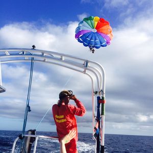 夫婦二人での恒例のハワイ旅行、ワイキキの空にパラセイリングが見えたので急遽NETで検索。翌日の予約を受けてもらえたので早速申込み。当日の現地受付は日本語でしてもらえましたが、船のクルーは英語オンリー。でも陽気に分かりやすく説明してもらえるので、簡単な英単語さえわかれば問題ありません。飛ぶ事自体はとにかく楽しい!!景色も良いし、浮遊感もばっちり、なにも怖いことはありませんでした。時間がある方はぜひ体験してください。